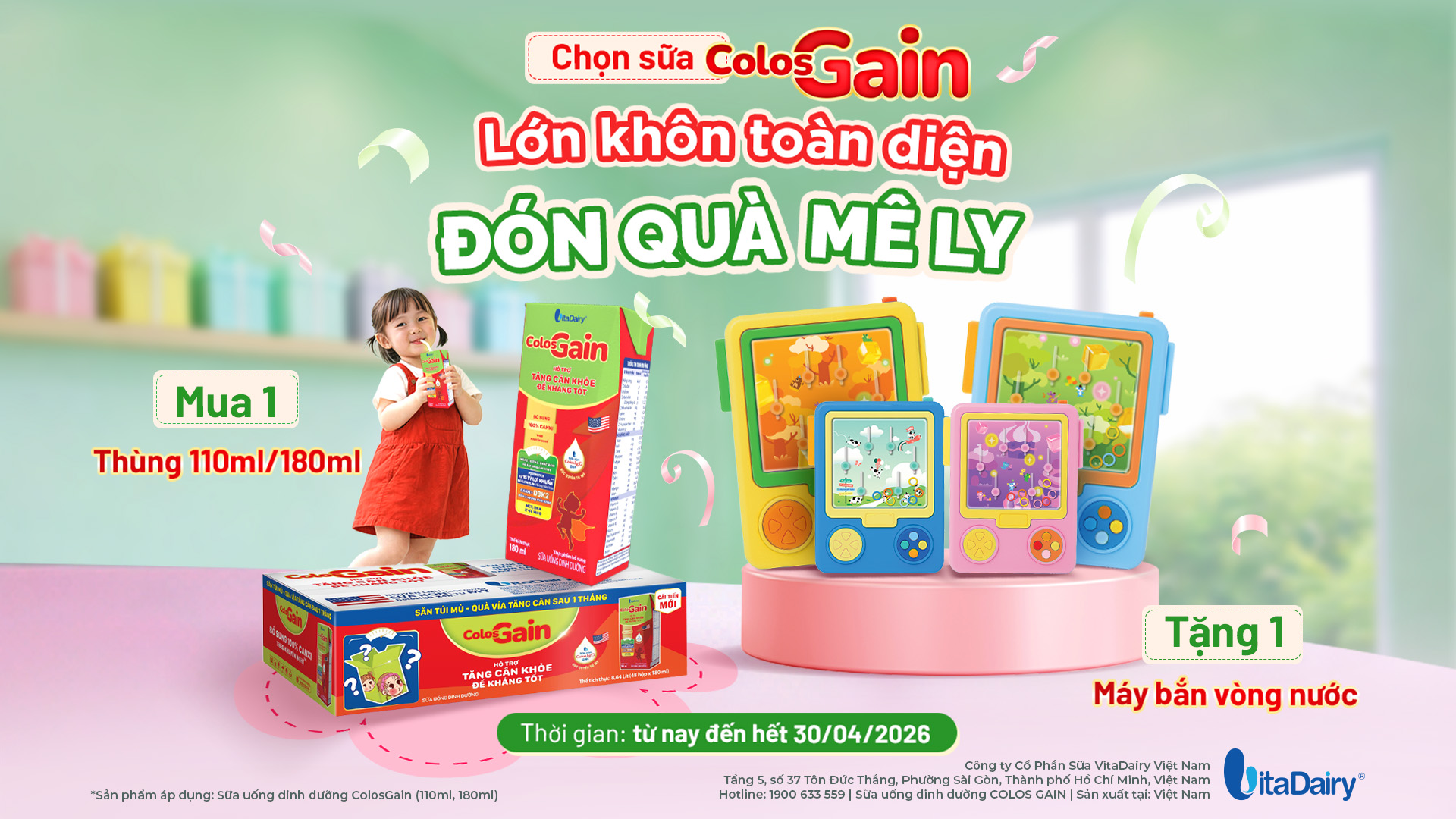 Quà tặng áp dụng: Khi mua 01 thùng sản phẩm SBPS ColosGain 110ml/180ml quý khách hàng sẽ nhận được 01 đồ chơi máy bắn vòng nước.
