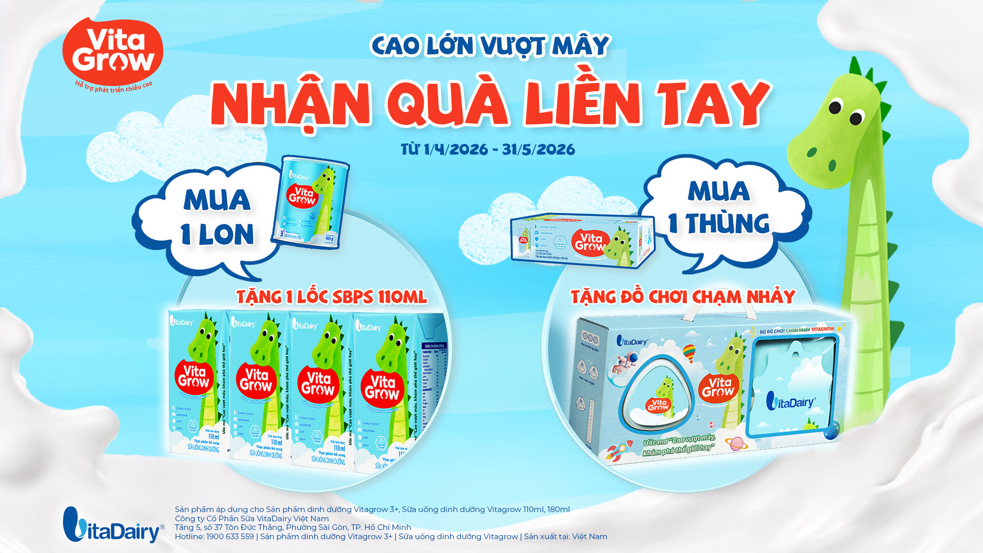 - Khách hàng khi mua 01 lon VitaGrow 3+ bất kỳ sẽ được tặng 1 lốc SUDD VitaGrow cải tiến 110ml