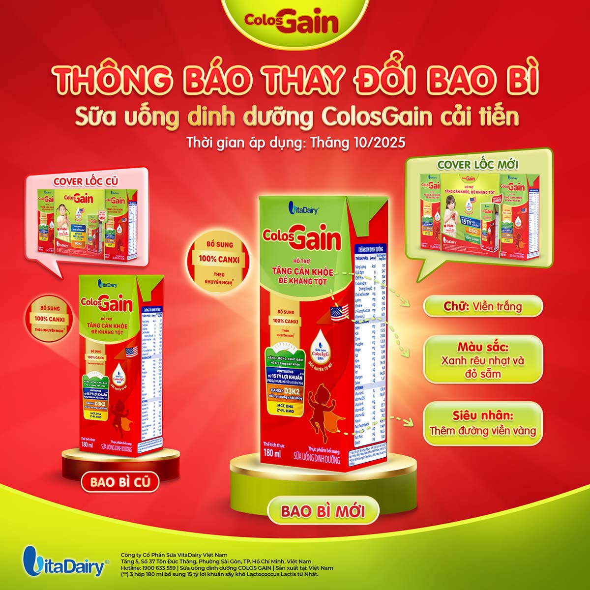 VITADAIRY THÔNG BÁO THAY ĐỔI THIẾT KẾ BAO BÌ SỮA UỐNG DINH DƯỠNG COLOSGAIN CẢI TIẾN